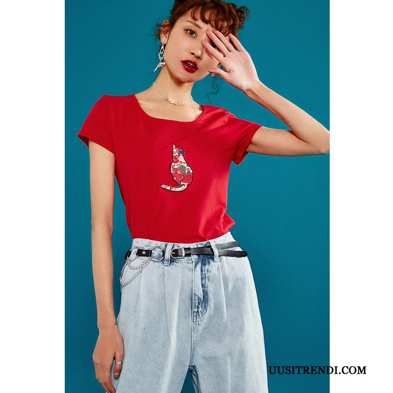 T-paidat Naisten Osta Puuvilla Kirjonta Löysät Takki Lyhythihainen Valkoinen
